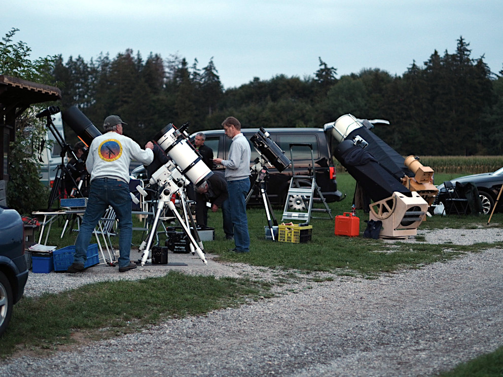 Bein Teleskoptreffen waren wieder viele Teleskope aufgebaut und über den gesamten Nachmittag hinweg haben zahlreiche Besucher vorbei geschaut. Am Abend wurden die Wolken vorübergehend sehr dicht, so dass zunächst keine Beobachtung möglich war. Aber im lauf des Abend hat es dann doch noch völlig aufgeklart, auch wenn es etwas dunstig war. So konnten die mehr als 40 Besucher, die gezielt am Abend zum Beobachten gekommen sind, doch noch einen Blick durch die vielen Teleskope werfen. Ganz besonders habe ich mich über den Besuch von Christine Zerbe, der 1. Vorsitzenden der Astronomischen Vereinigung Augsburg e.V., gefreut. Ab Mitternacht bauten die Mitglieder ihre mitgebrachten Teleskope so langsam ab, die inzwischen von Tau alle klatschnass waren. (Bernd Koch)